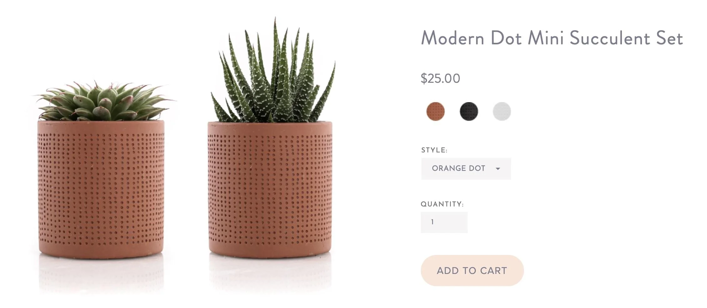 Instead of having a text dropdown for your variants, you can now display a color or size as a swatch. In the example below, I used this plugin to beautifully display color swatches for an online plant shop.