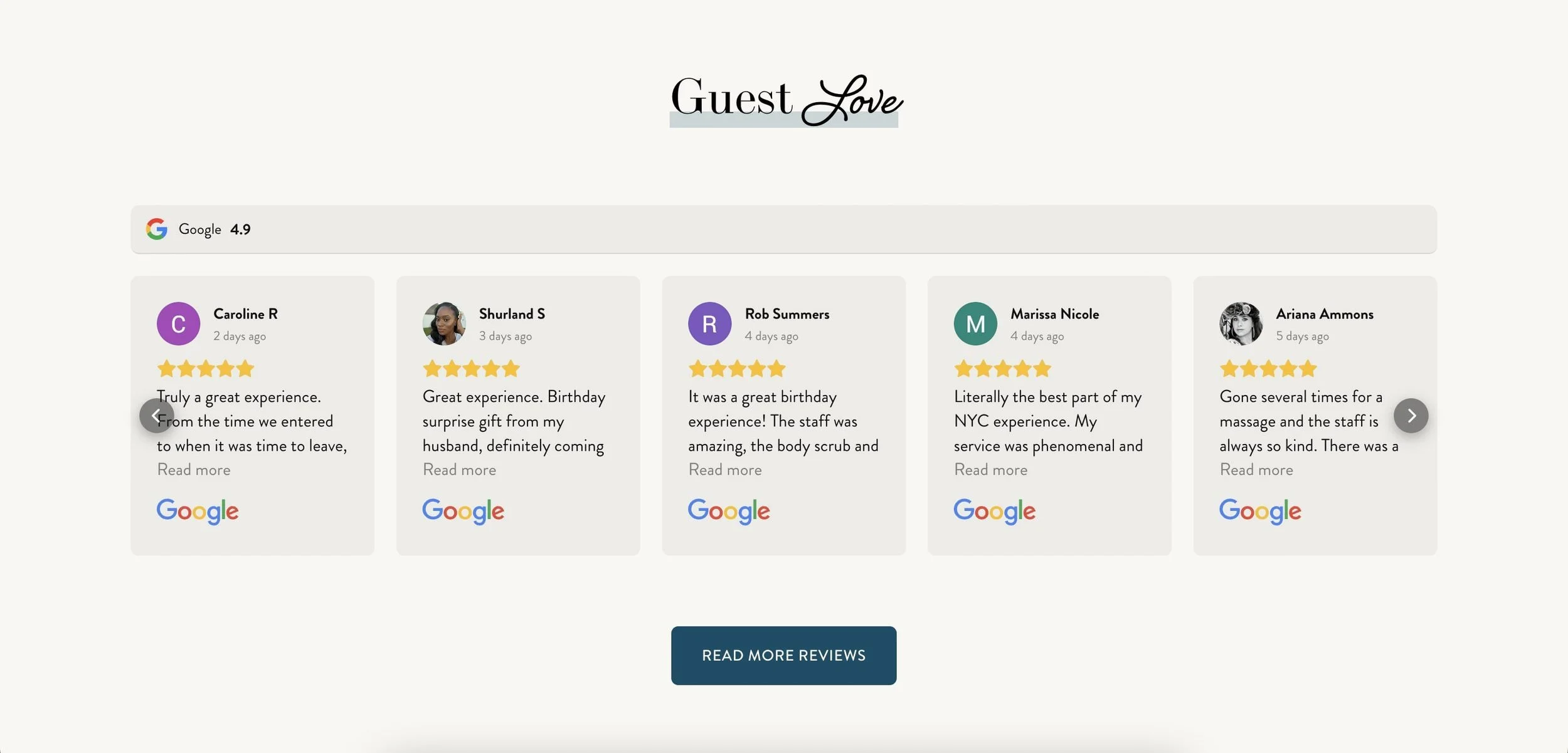The Google Reviews Plugin by Elfsight allows you to embed Google Reviews directly into your Squarespace website. You only need to embed the code once on your website and the reviews will update automatically every time you get a new Google Review. Plus, you can control which reviews display on your site! See below for a detailed, step-by-step guide on how to use this plugin.