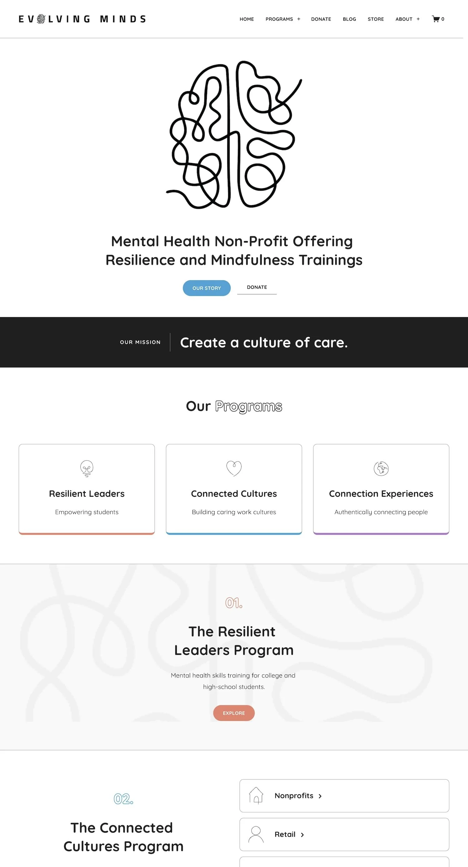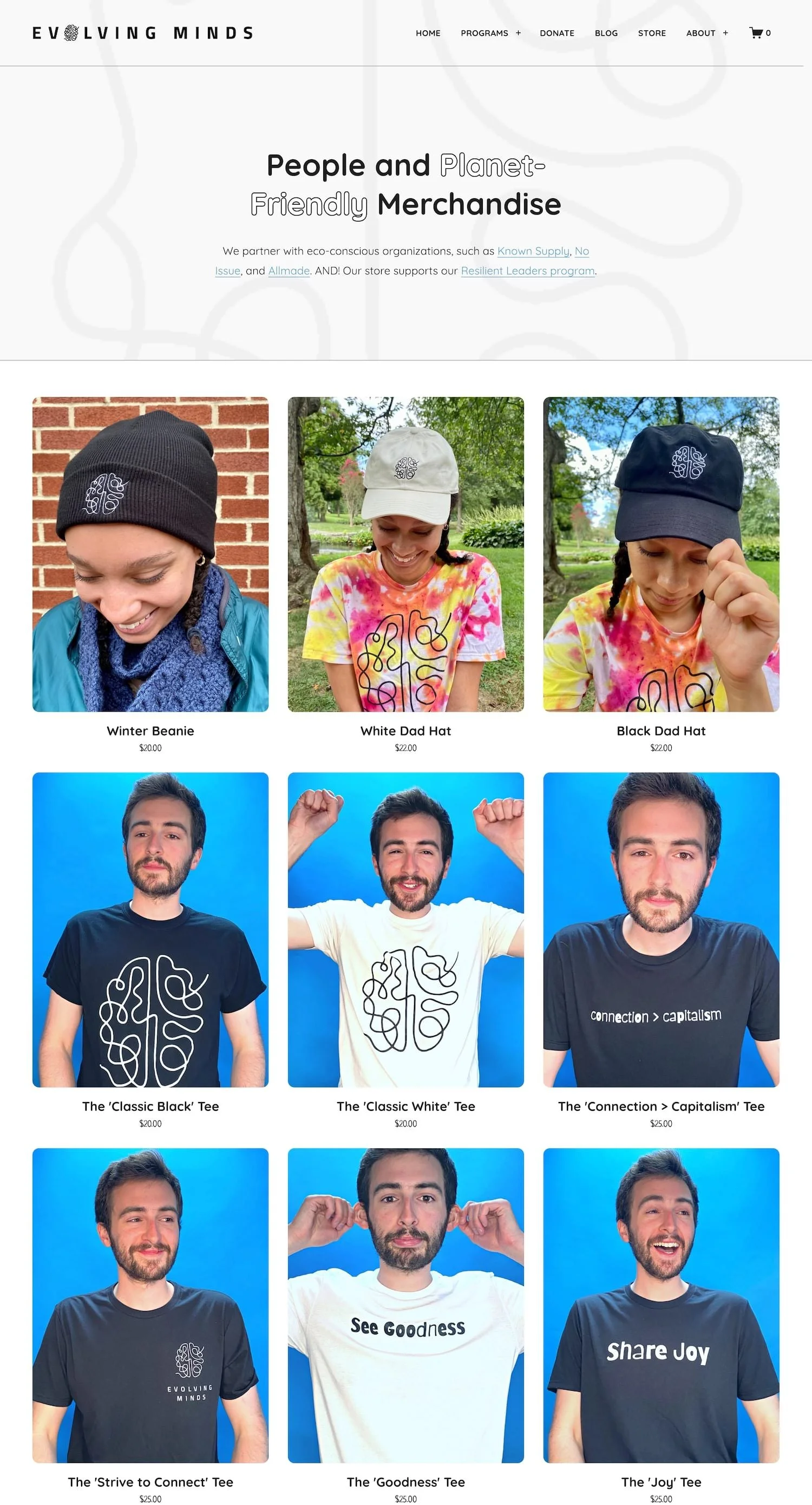 Evolving Minds is a mental health non-profit that offers resilience and mindfulness trainings to students, employees, and organizations. Their site primary focuses on their programs but they do have a small ecommerce shop where they sell some cool merch. Their product images are fantastic and give off a very millennial vibe which fits their mission well. The ecommerce portion of the site is simple, clean, and user-friendly. This site nicely showcases what you can do with a Squarespace shop without overcomplicating things.