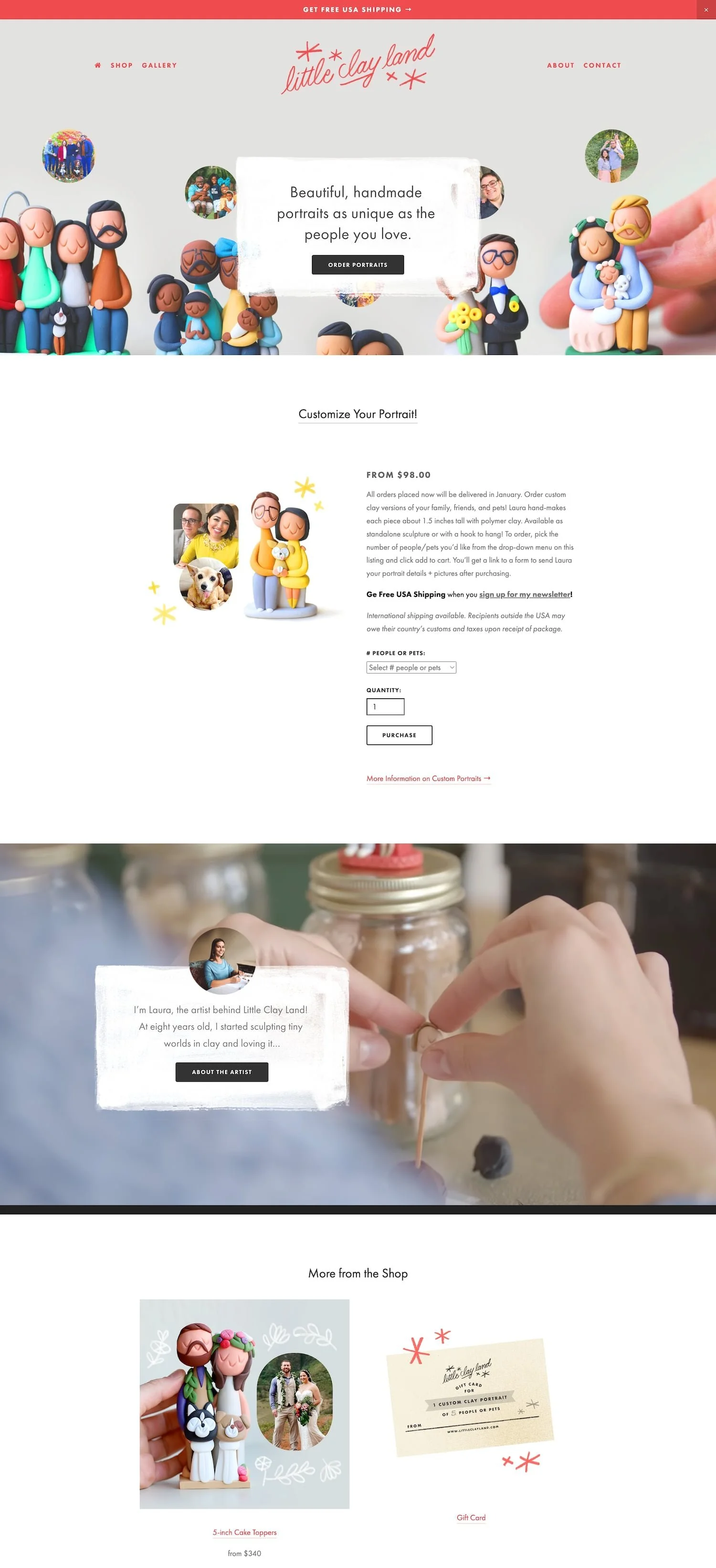 Little Clay Land sells beautiful, handmade clay figures. This is a super unique gift idea! About halfway down the homepage, you’ll find a large background video of Laura (artist and owner of Little Clay Land) designing and building one of her figures. I think this video adds such a personal touch and really conveys the concept that each gift is handmade with love. Each product page contains ample images, details, and specifications which I can imagine really helps reduce the amount of customer questions. If you’re looking for a super cute web design that makes great use of Squarespace’s ecommerce features, I would definitely check this one out.
