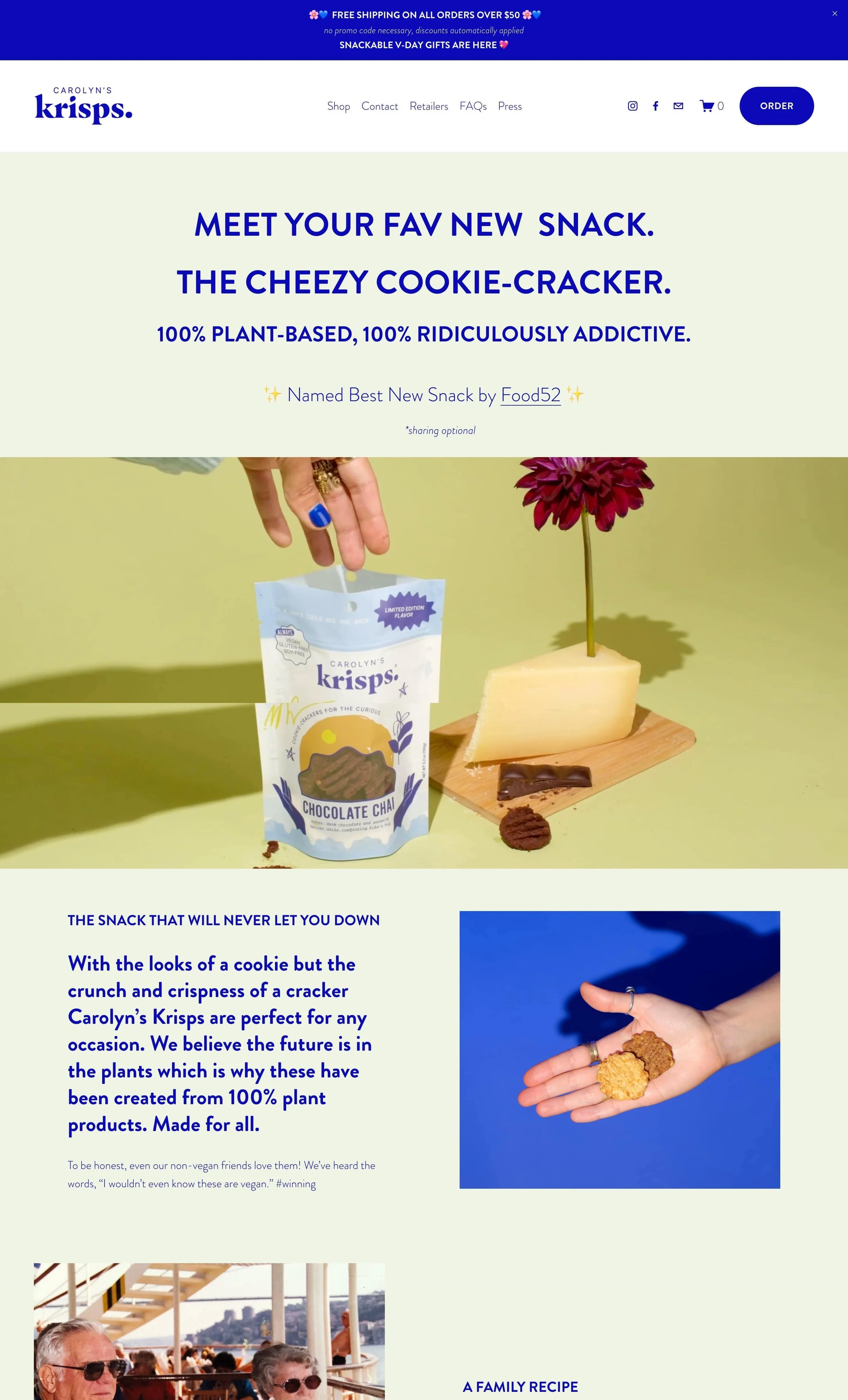 Carolyn’s Krisps sells plan based cheesy cookie crackers that are ridiculously addictive! I love the video GIF they use on their homepage showing a person reaching into the product bag - super engaging! Their large, detailed images are also wonderful and really helps the customer get a feel for the product.