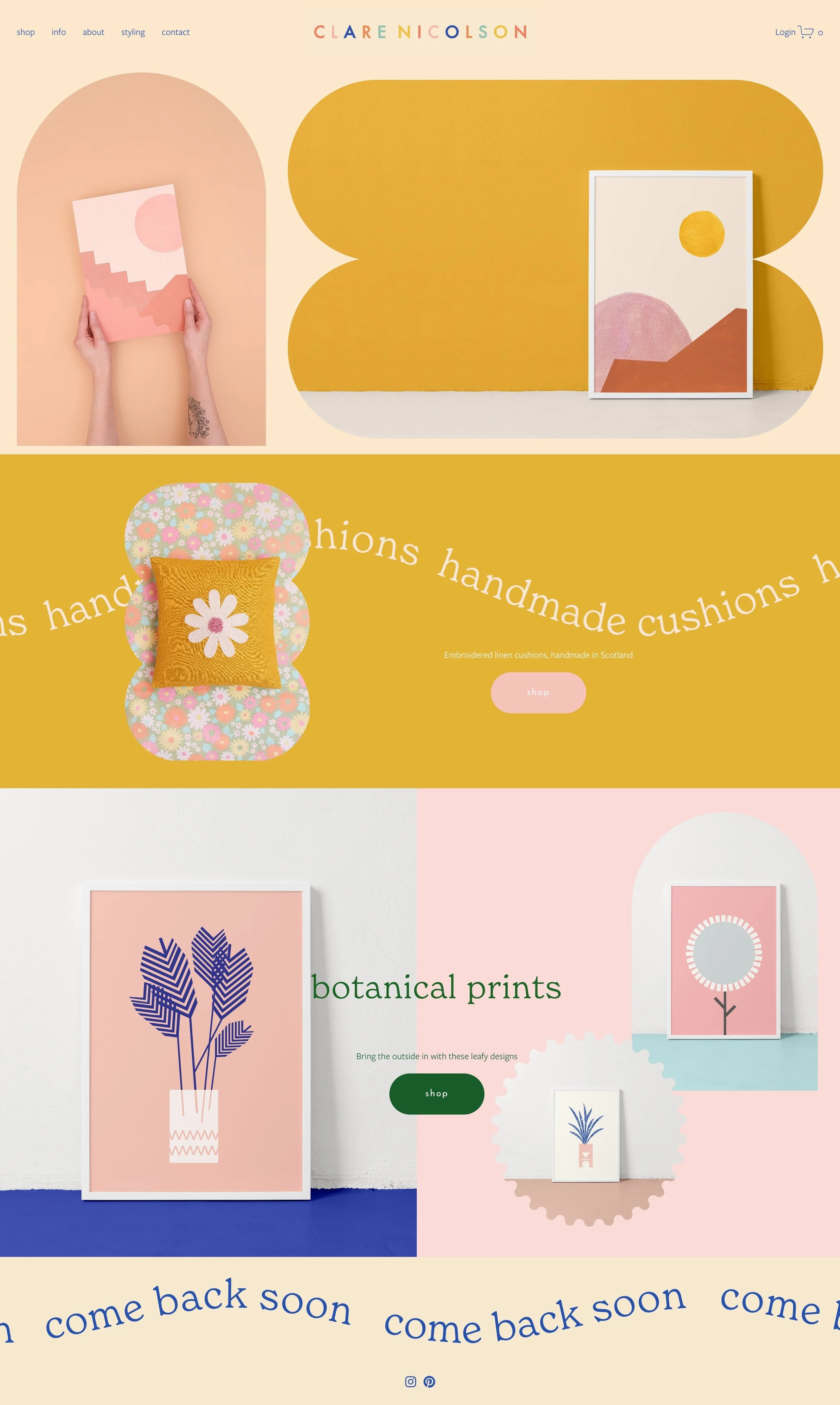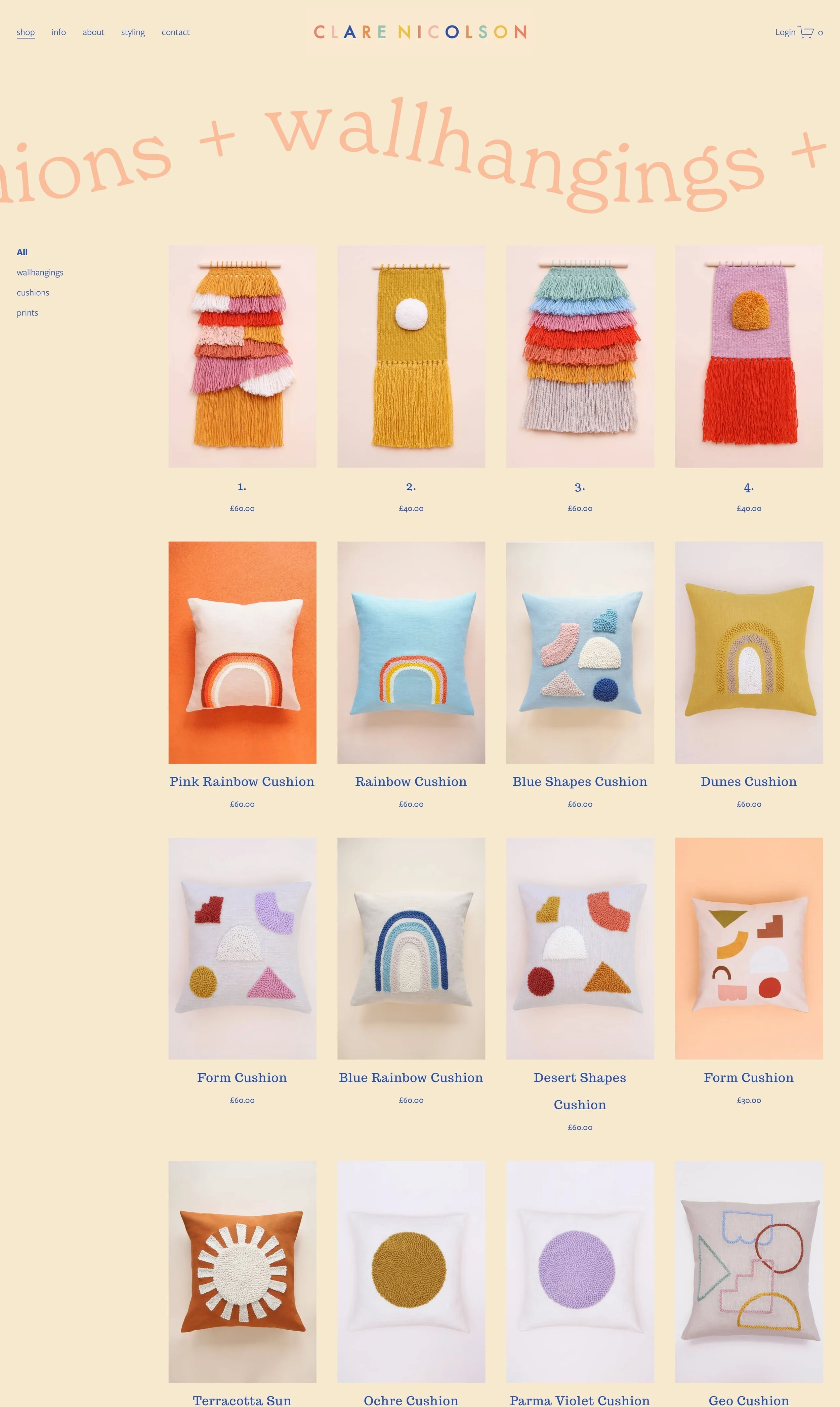 Clare sells handmade cushions, botanical prints, and wallhangings on her Squarespace store. I love how she makes use of Squarespace's funky shapes on her shop to help add an engaging and dynamic element to the overall site flow. The playful and creative vibes of her site really demonstrate Clare's unique approach to design, giving the user an idea of what you can expect when you purchase one of her products.