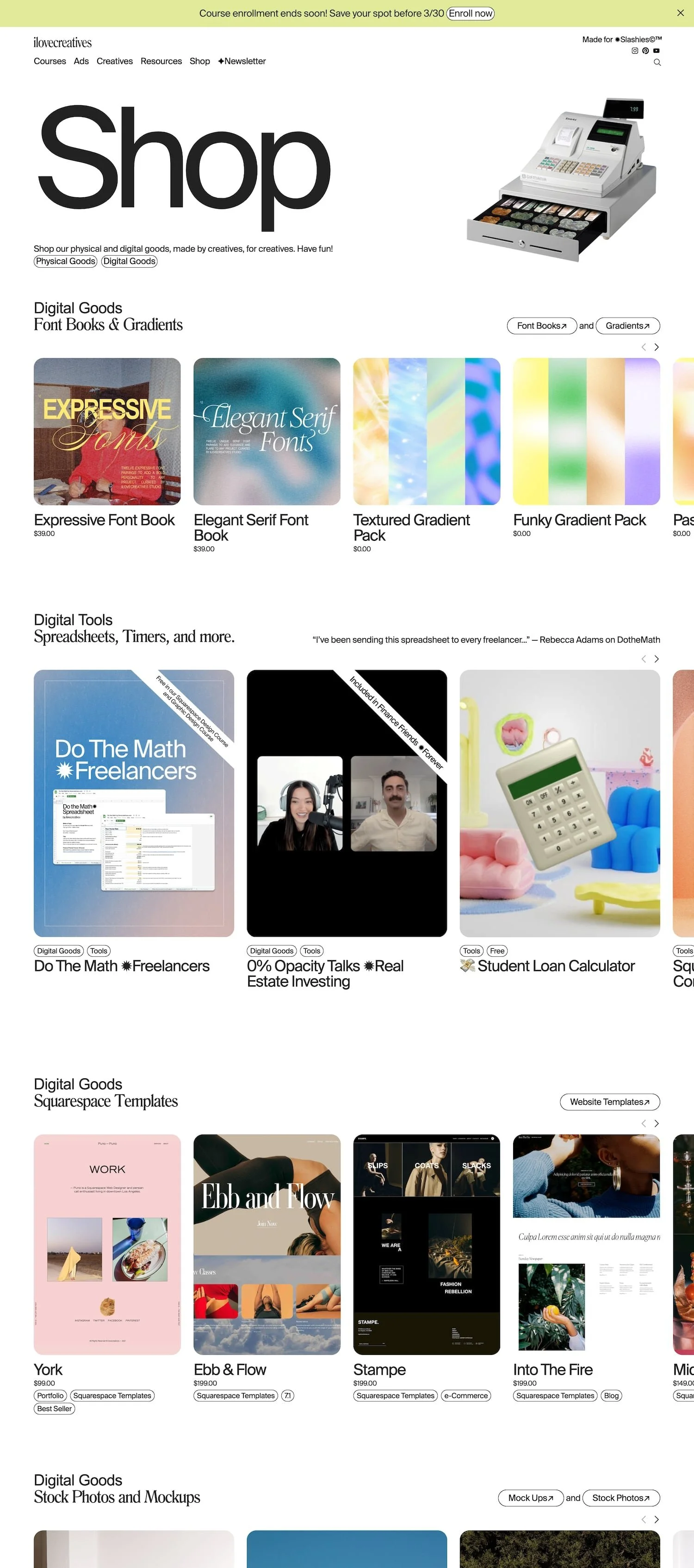 If you need some inspiration from an ultra modern, trendy ecommerce shop on Squarespace, definitely take some notes from iLoveCreatives. These guys sell courses for basically any type of creative freelancer, digital products such as website templates, mockups, and code snippets and even some physical products such as planners and candles that incorporate their own personal branding.