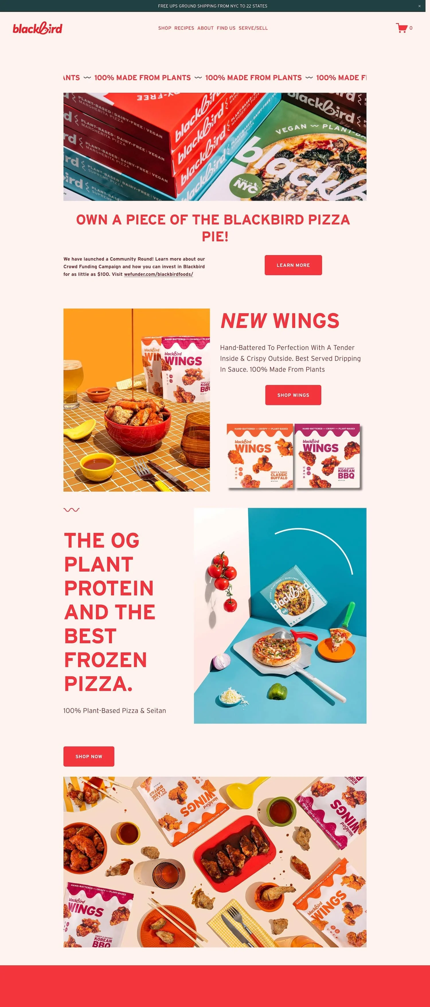 Blackbird Foods is an artisanal producer of plant-based Pizza, Seitan, and wings. The pride themselves on using only natural, non GMO ingredients that are 100% plant-based, cholesterol-free, vegan, and kosher. Their website effectively portrays that they sell good food that’s also good for you. The website is super responsive, mobile-friendly, and concise while still being fun to look at and visually engaging for visitors.