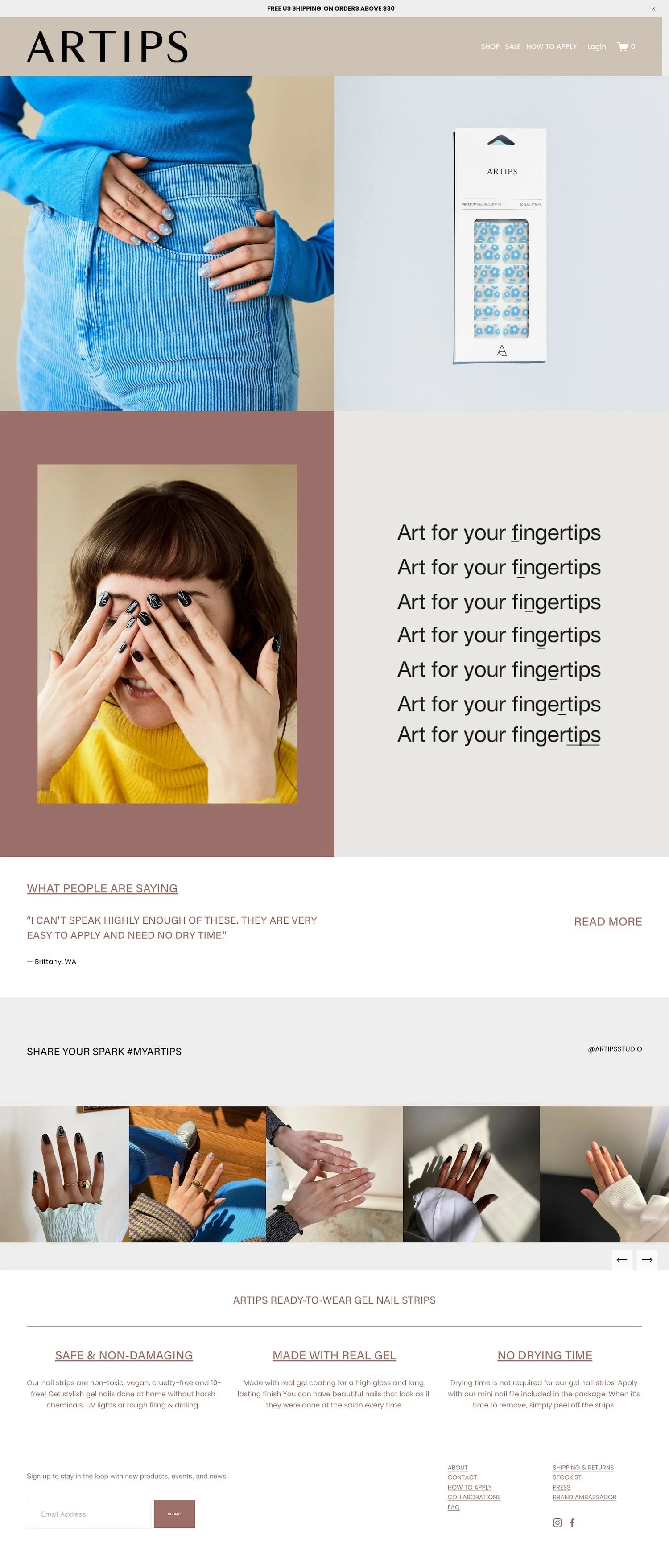 Press-on nails have made quite the splash recently. With the global pandemic and people not wanting to visit salons in-person, it really left room for this niche industry to grow. Artips certainly capitalized on this opportunity with their fun, stylish, and easy-to-apply press-on nails. They really let their product images do the talking on their website. I love how their shop page features the products in the packaging, and then when you hover over an image, you’ll see another super high-quality image of a model showing off the nails. Very striking!