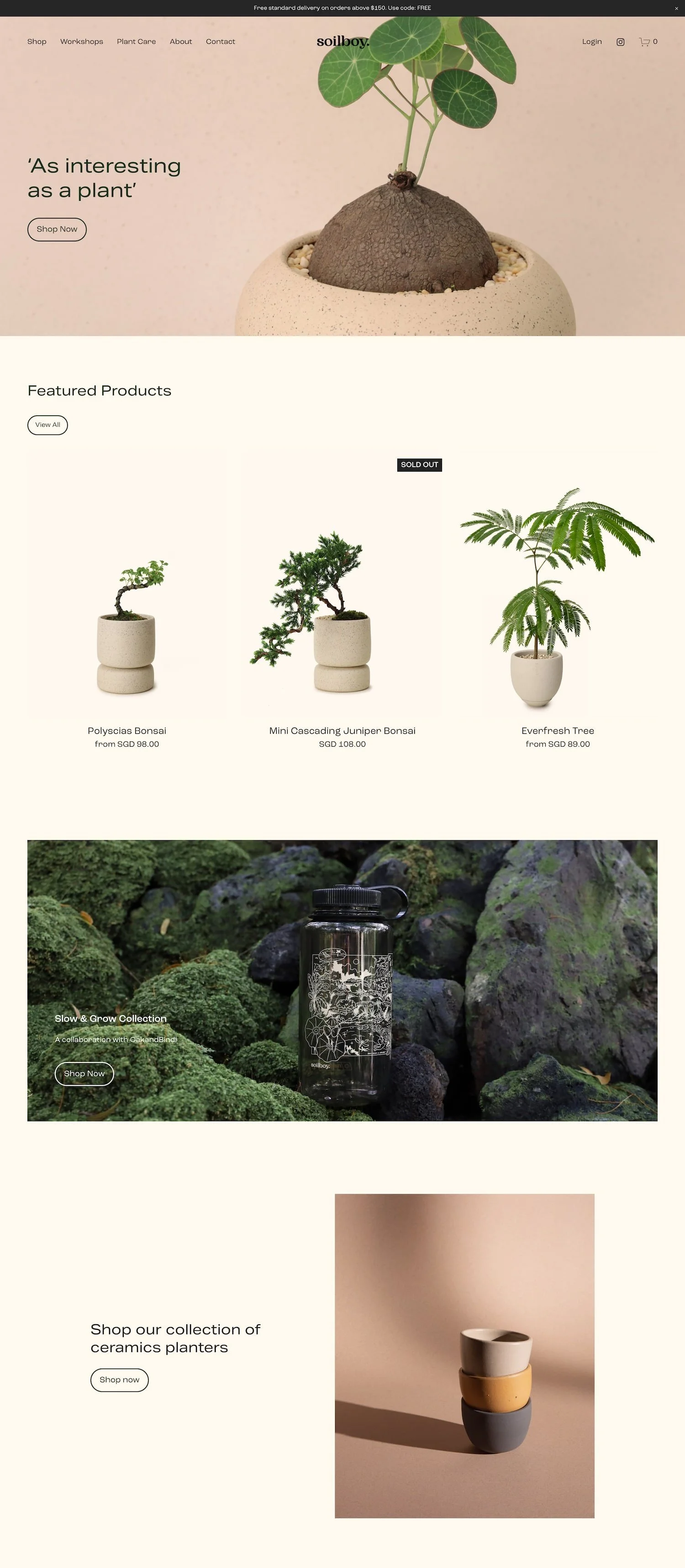 Soilboy Plants provides a simple, modern take to buying and caring for houseplants. They pride themselves on not only providing fresh, beautiful plants for their customers, but also supplying them with the tools and knowledge needed to care for their plants long-term. Their website is neutral, minimal and effortless in design, leaving room for their product images to really illuminate the pages.