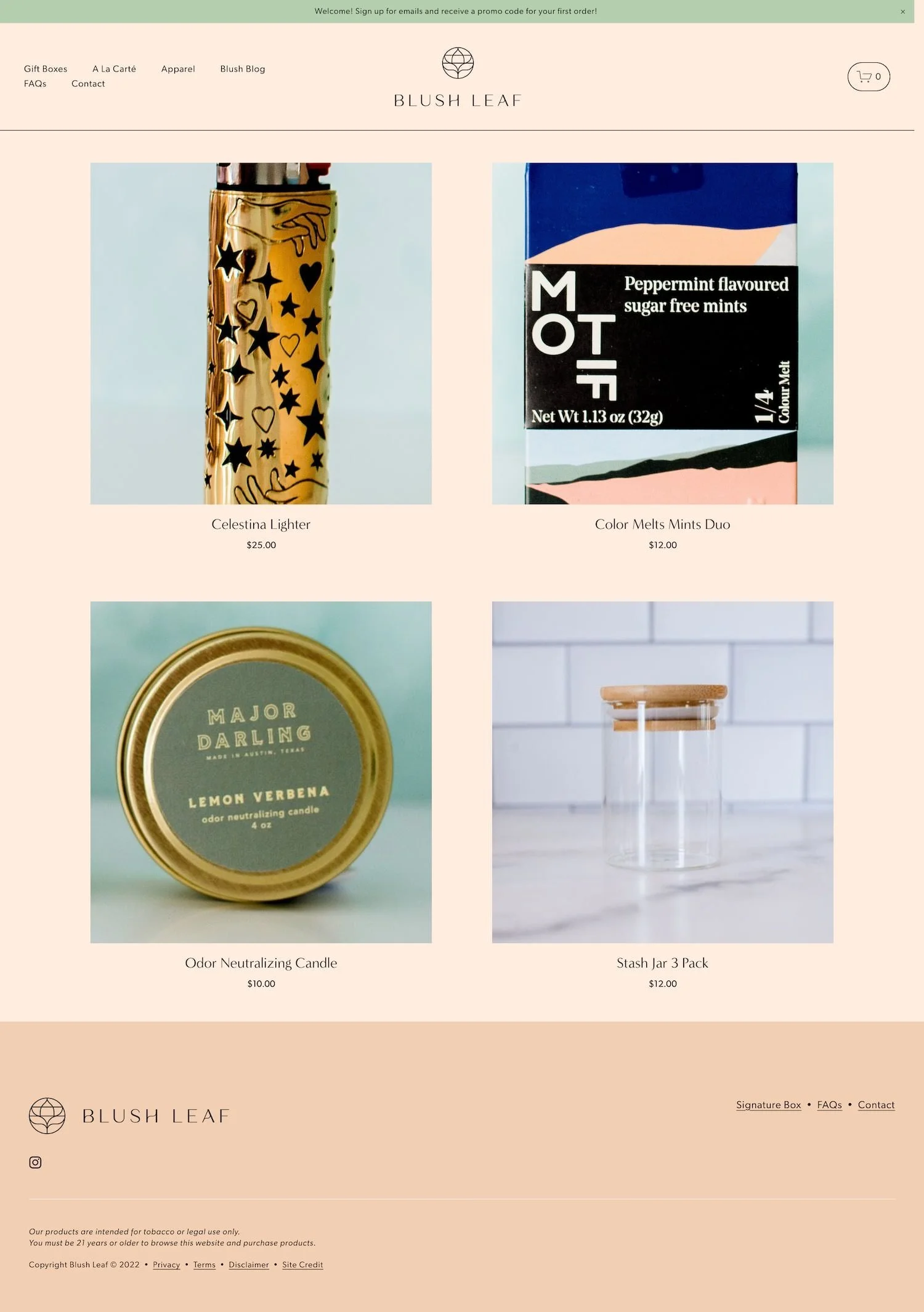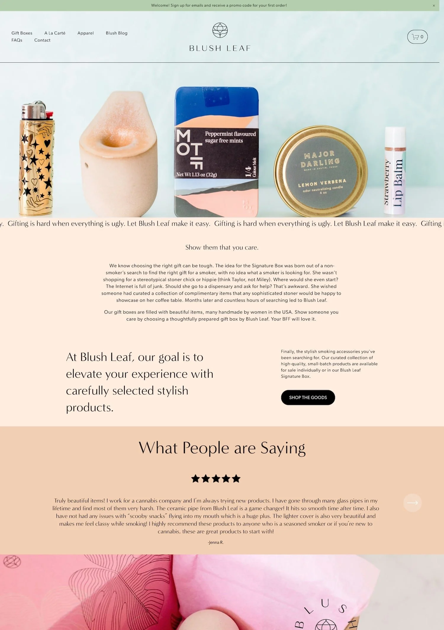 Blush Leaf Shop sells ceramic pipes and cute smoking accessories on their neutral yet stylish Squarespace website. Their homepage opens up with a large banner image containing a nice looking product lineup. This helps the user visualize exactly what they might find while shopping on this website. This shop sells a few different types of items ranging from a la carté products to apparel to gift boxes. Blush Leaf Shop is a great inspiration website if you’re looking for something that’s clean and minimal without being strikingly white. Their color scheme is a perfect blend of creamy, warm, and inviting!