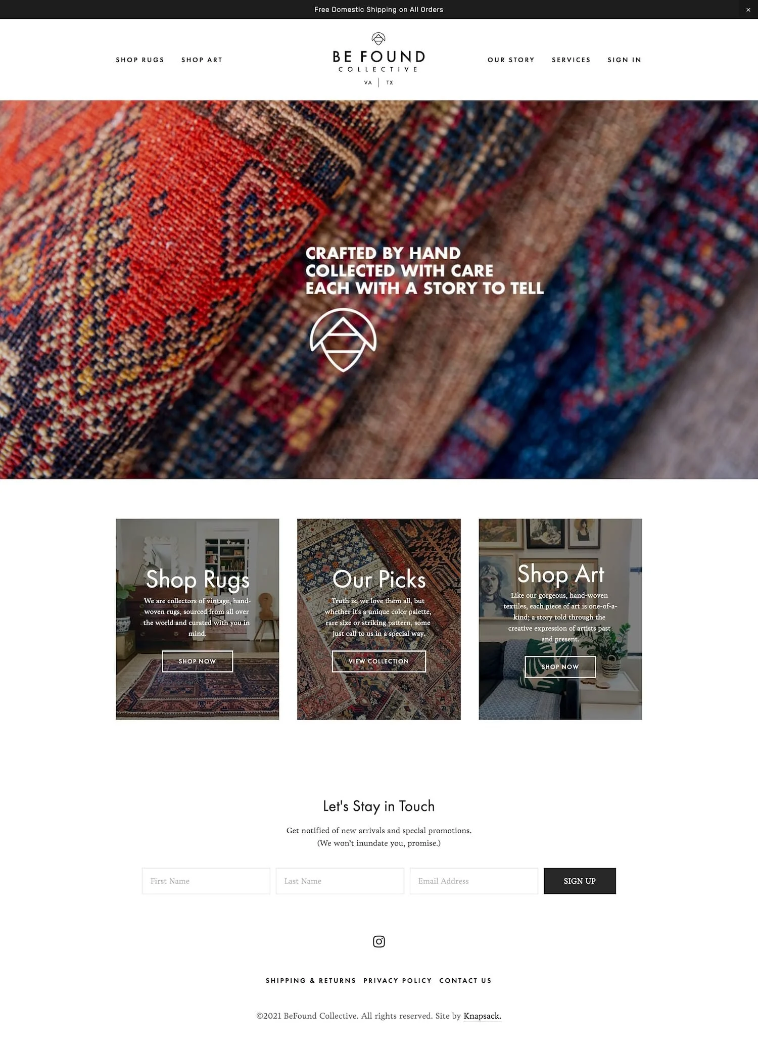 BeFound Collective sells unique handwoven rugs on their Squarespace website. In addition to selling rugs, they also offer rug repair services to help repair and reinforce worn and distressed rugs. This is a great idea as they are able to appeal to a few different markets here (those who are seeking vintage rugs and those who need help with their current vintage rugs). Their website is simple with a black and white, modern style. However, this really helps their product images capture your attention and become the centerpiece and main focus.