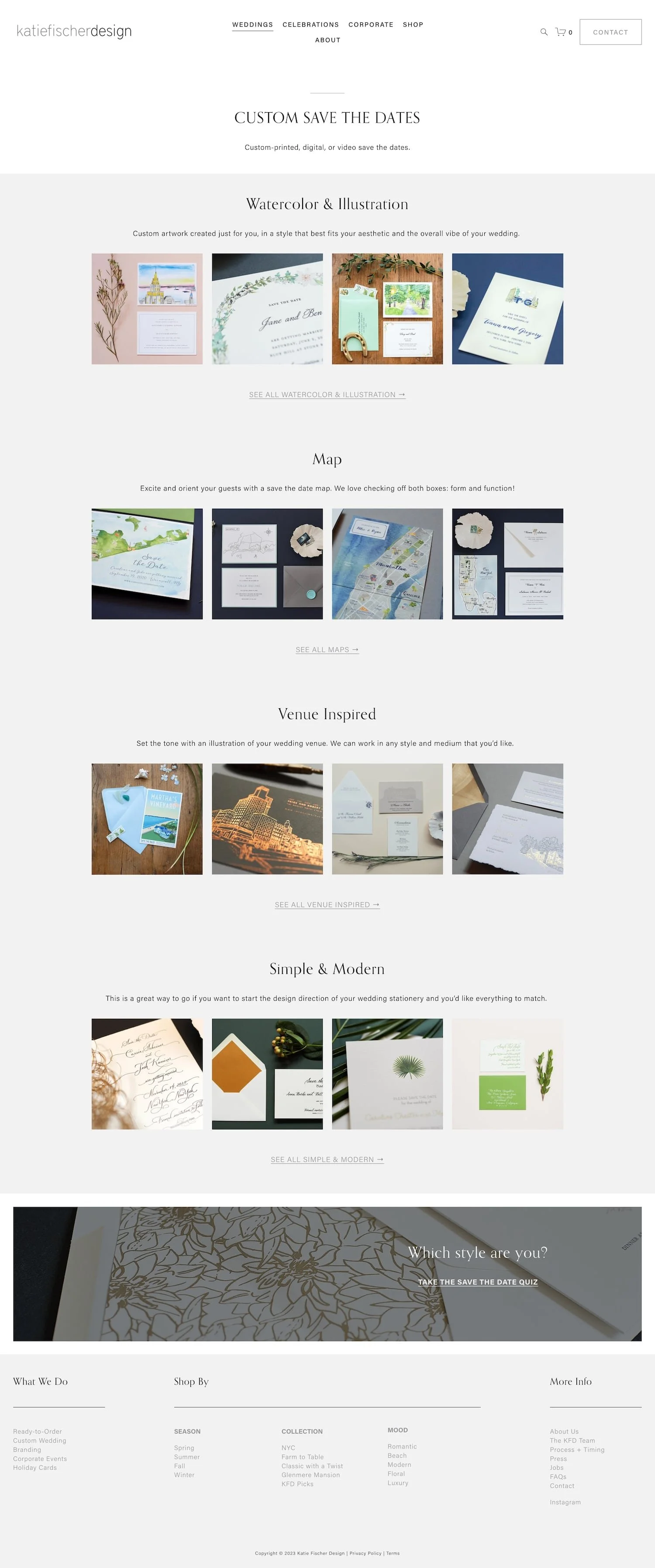 Katie Fischer sells luxury invitations, evites, stationery, and websites for weddings, galas, and events. Her website opens up with a large background video that beautifully showcases some of her products. This is a stunning first impression and leaves the visitor wanting to see more. The rest of the website consists mainly thumbnails images that you can click into to see corresponding products. This website is not very text heavy at all, which works well because she is selling custom stationary and certainly showcases images of those products very well.