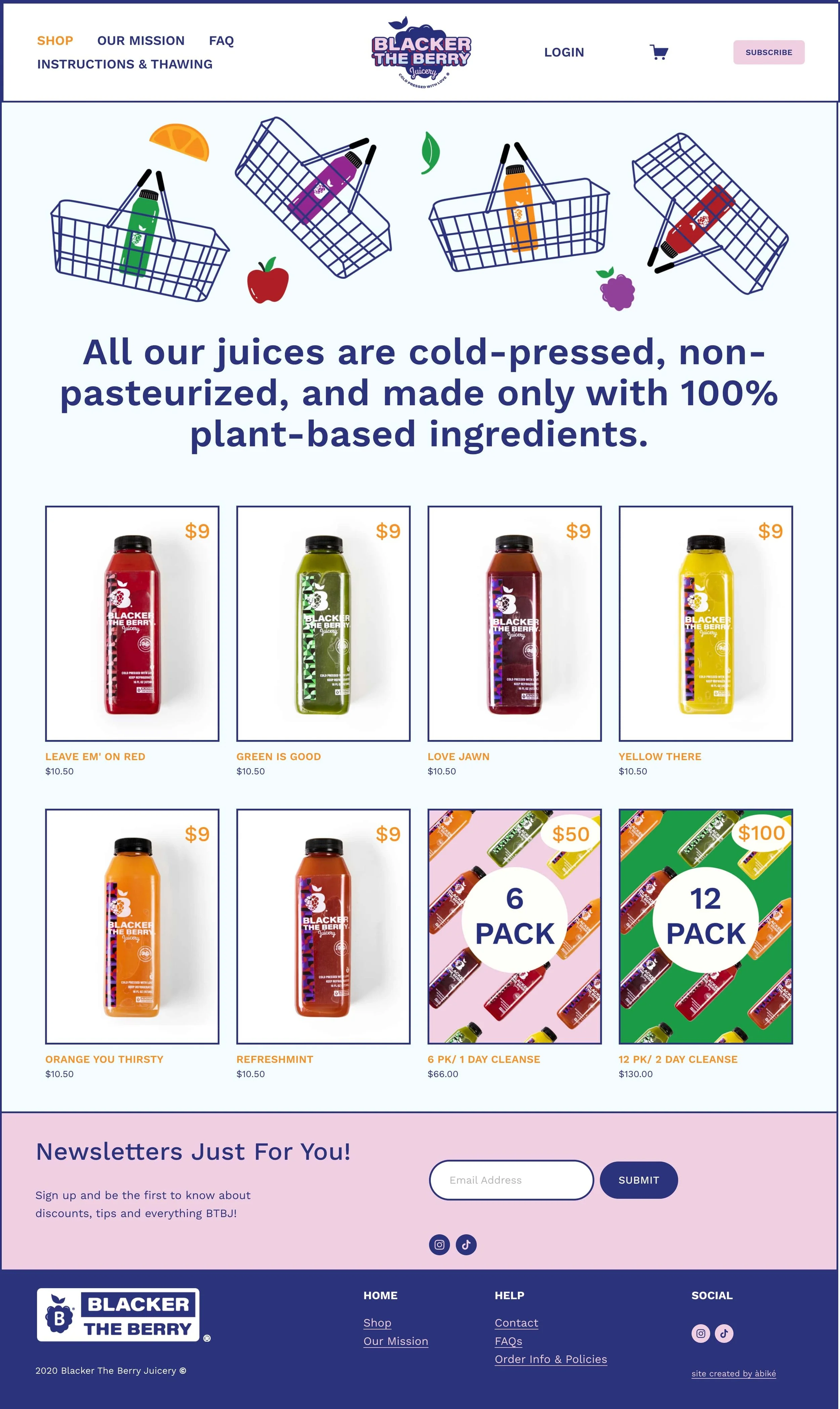 Blacker The Berry Juicery is a brand focused on building a global community around health and social justice. They are on a mission is to inspire others and spread love through healthy food options. Their visually appealing website captivates visitors from the moment they land on the page, creating an engaging and delightful user experience. Additionally, their user-friendly interface (built with Squarespace) ensures that navigating the website and making a purchase is a seamless and enjoyable process.