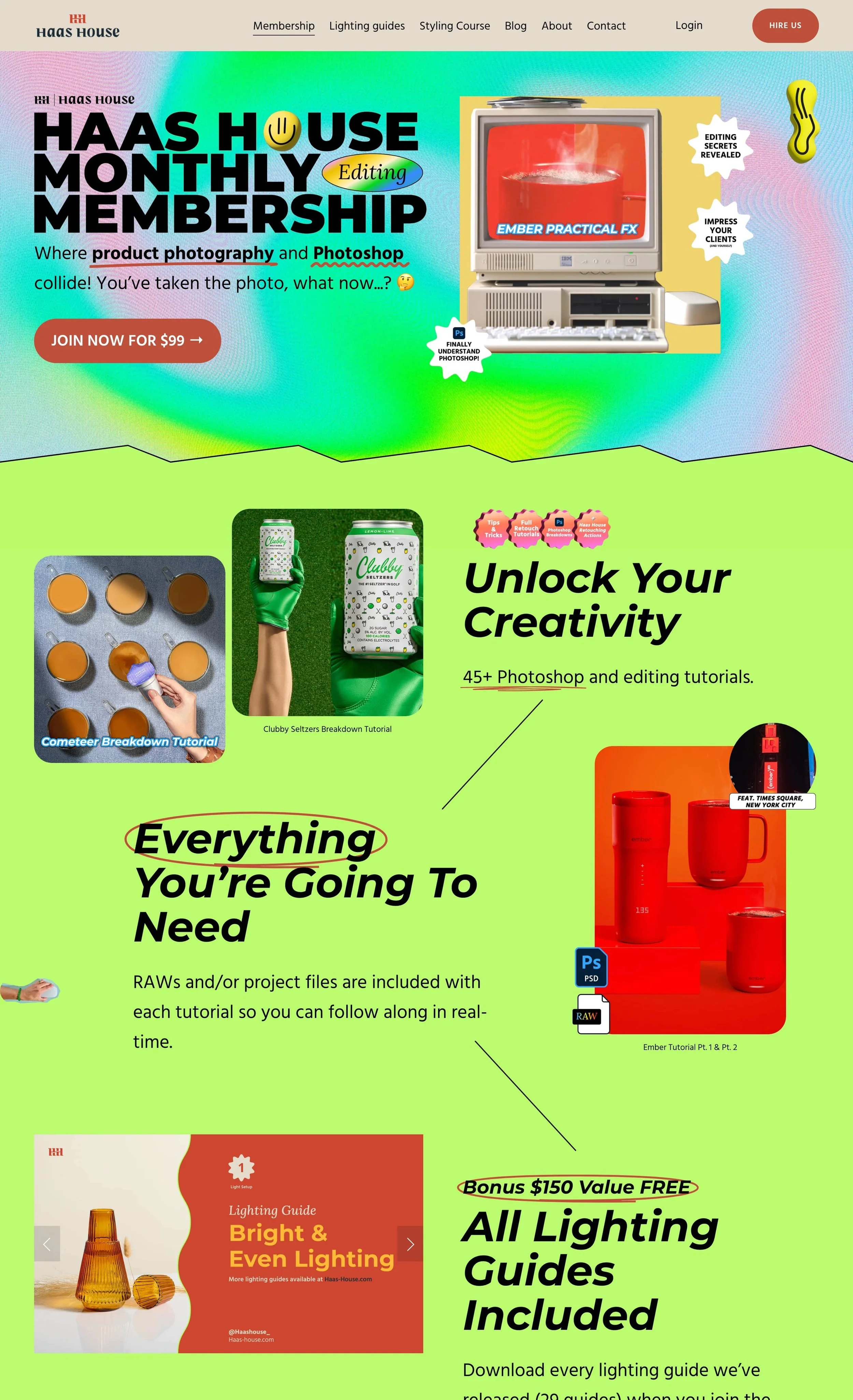 Haas House sells monthly memberships and lighting guides to teach you everything you need to know about product photography and editing in Photoshop. Their website is designed to be bright, bold, and fun, offering an engaging online experience for visitors. With vibrant colors, dynamic typography, and lively visuals, the website reflects a modern and energetic aesthetic that helps captivate their ideal crowd.