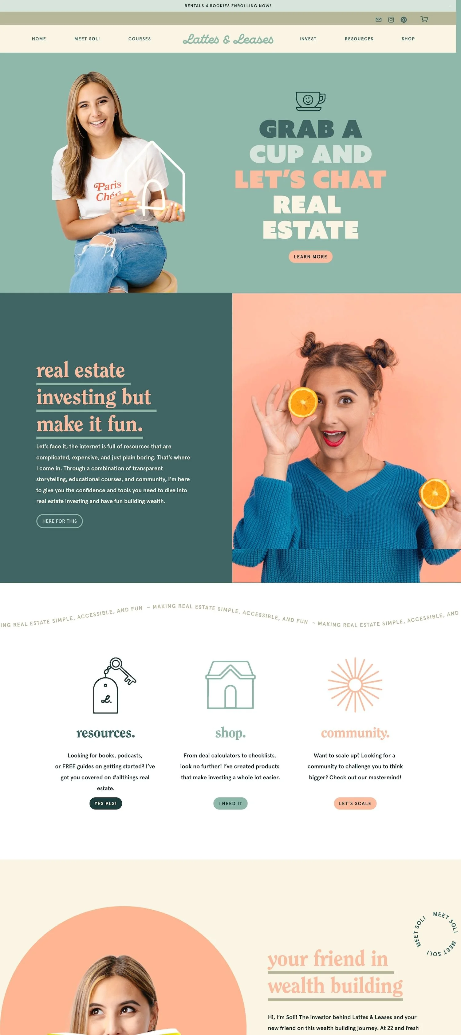 Another fun digital product shop to add to this list is Lattes & Leases. This company teaches real estate investing but tries to make it fun, relatable, and achievable for everyone. Their website has many custom graphics and GIFs which helps make it engaging and further conveys that they are here to make real estate investing less boring. This website is bright + vibrant while still being neutral + calming which is hard to do, so kudos to them!