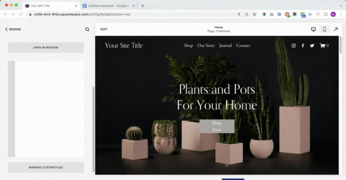 Next, we’ll need to add the icons we just downloaded to the website. In your Squarespace website, navigate to Custom CSS (Design > Custom CSS). Scroll down to the bottom of the Custom CSS panel until you find the MANAGE CUSTOM FILES button. This is where you’ll be uploading the icons.
