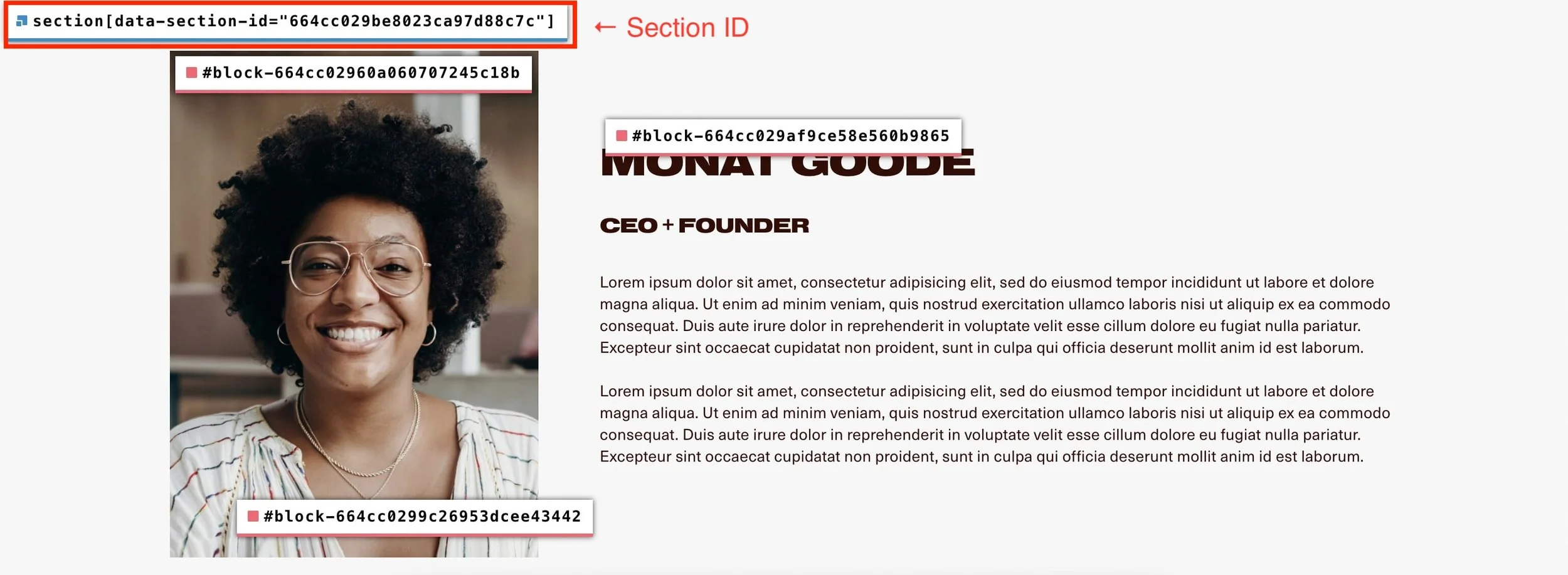 The section ID will look like this: section[data-section-id="664cc029be8023ca97d88c7c"]. You can click to copy the section ID, however, we will only need the string of numbers from the section ID which in this example would be 664cc029be8023ca97d88c7c