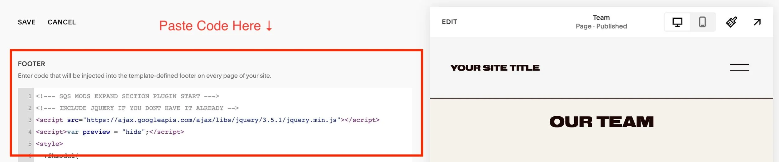 Important Note: Your expandable sections will be hidden by default in the Squarespace editing dashboard. So if you need to make changes to them, you will need to temporarily tweak the footer injection code. Towards the top of the footer injection code, look for: preview = "hide". Change "hide" to "show" only while you are making changes to your hidden sections. Make sure to change back to hide when you are done making edits!