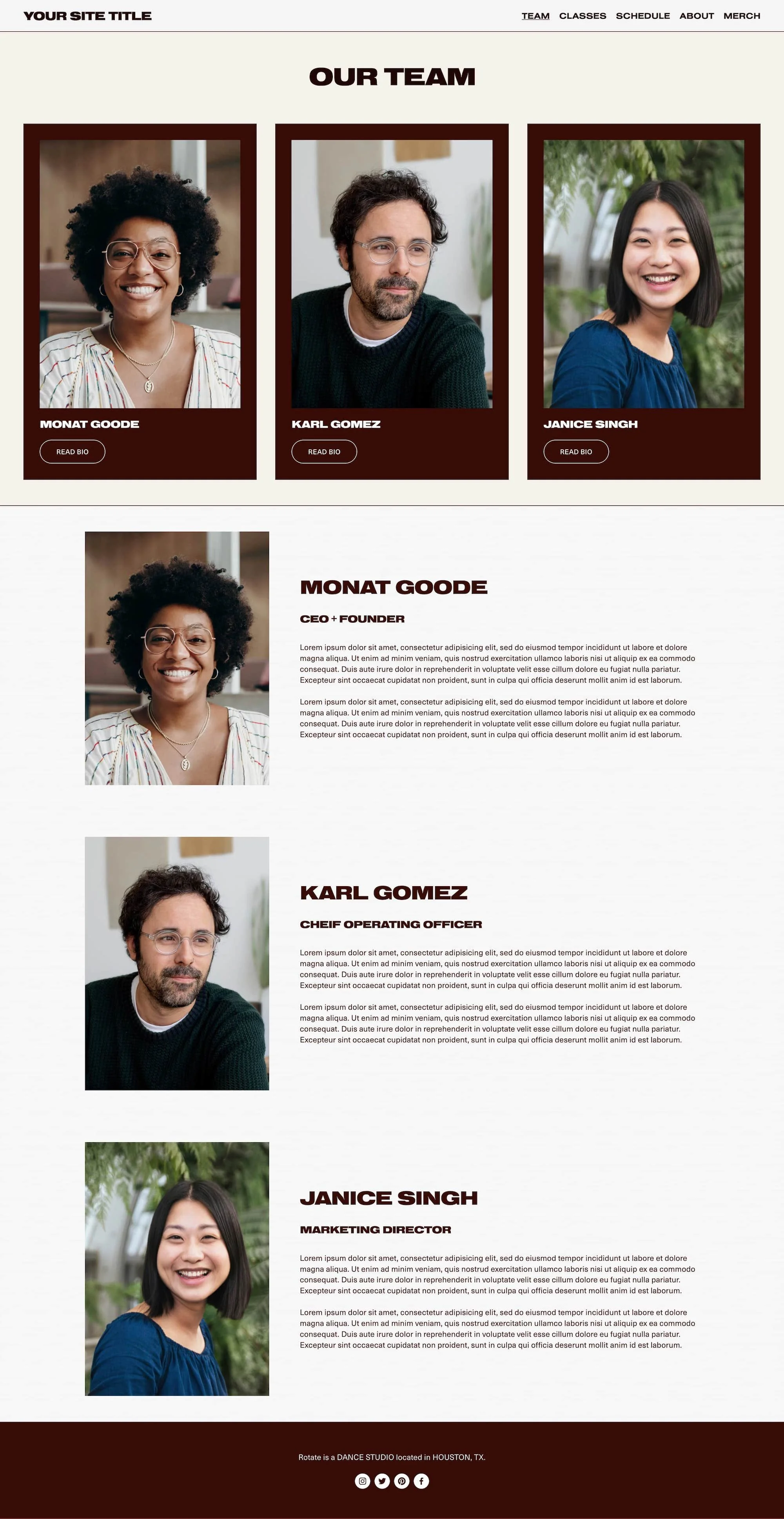Example: If you’re creating a team page with hidden bios for each team member, I recommend creating a team gallery with “Read Bio” buttons for each person. Then, underneath the team gallery, create an individual section for each team member with their bio. Just stack the sections on top of each other for now and then we will add the functionality for hiding/showing in the next steps. See example page below: