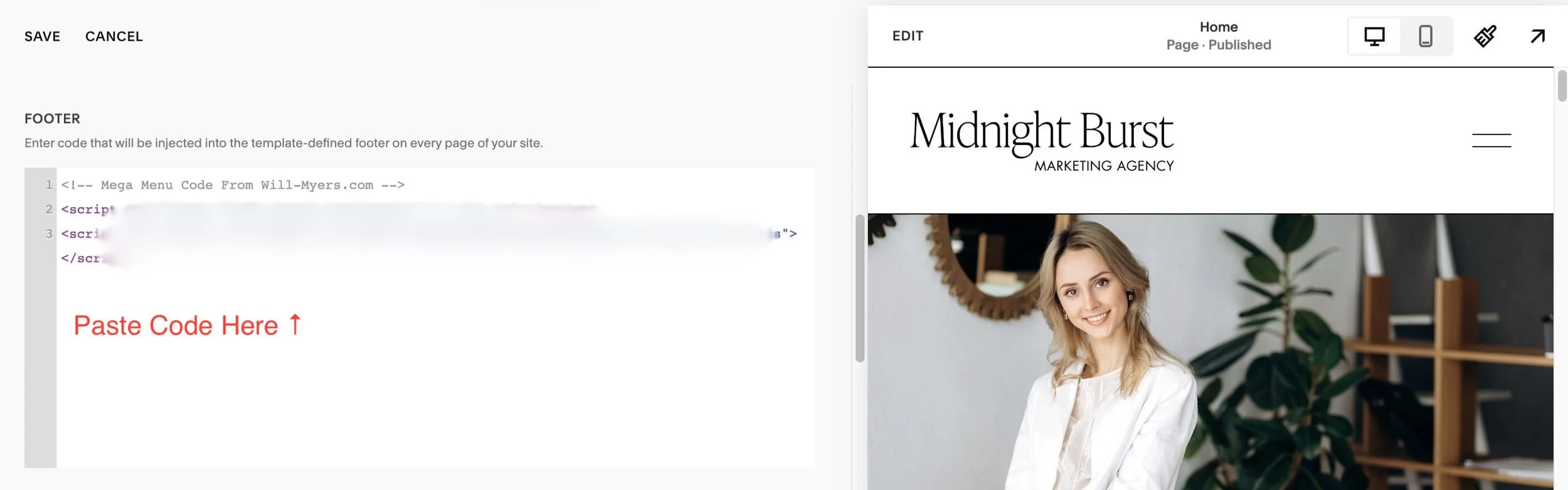 6. After you’ve pasted all of the code into the FOOTER field, make sure to click SAVE in the top left corner (NOTE: you will need to be on a Squarespace “Business” plan in order to add custom code to your website)